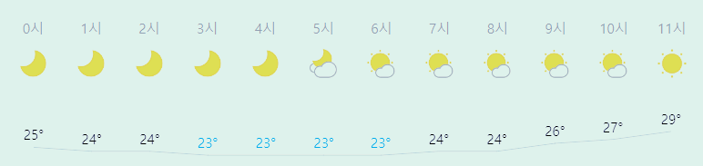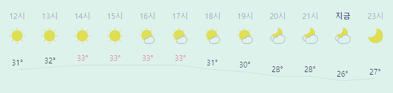 어제와 같은 최저기온, 어제보다 5도 높은 최고기온입니다 아침에 최저기온 영상 23도이고 낮 최고기온 영상 33도입니다 오전 3시 - 6시 최저기온이고 낮 14시 - 17시 최고기온입니다