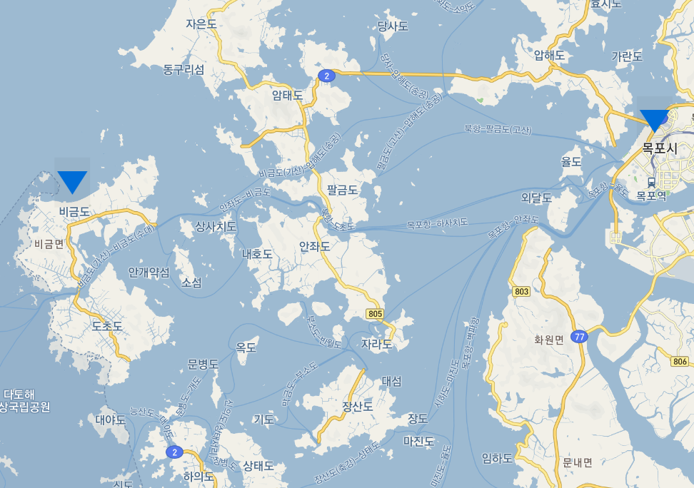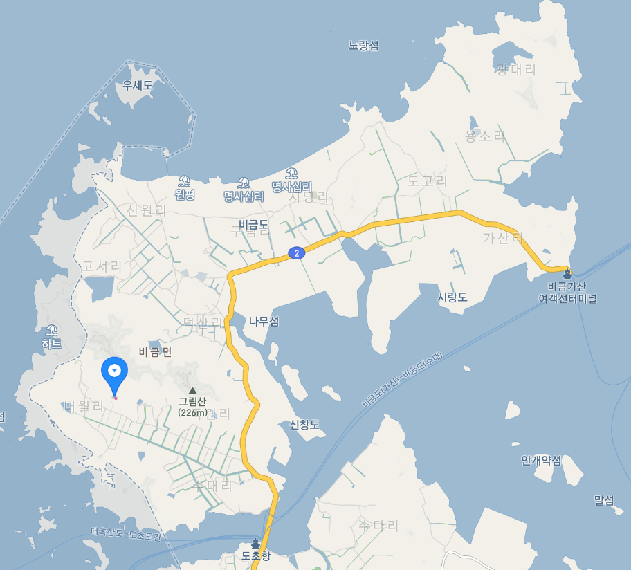 지도 좌측에 파랑색으로 표시한 곳이 비금도입니다. 비금도 남쪽에 위치한 도초도 섬과는 서남문대교로 연결되어 있습니다.