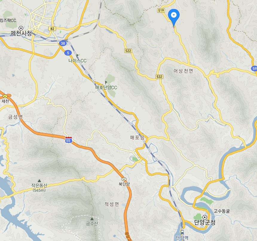 지도 상단 좌측에 제천시청이 위치합니다. 제천시청에서 단양군 어상천면 최은식 씨 쉼터대장간까지는 도로 기준으로 24km 정도 거리입니다.