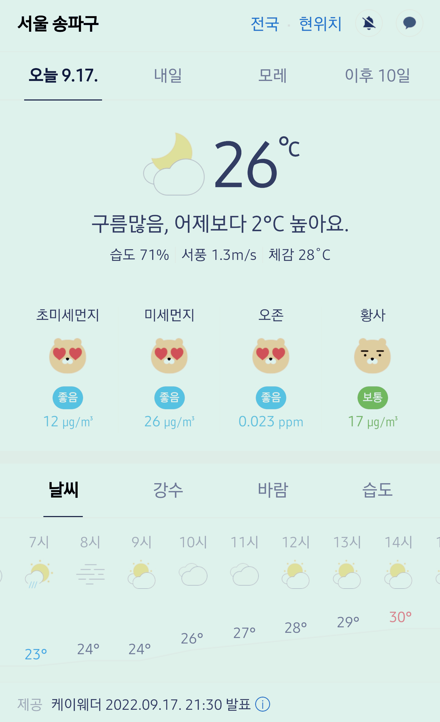 서울 강남 송파구 오늘의 날씨 2022년 9월 17일 (21시 30분 현재)