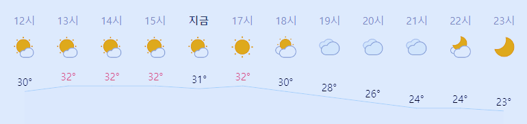 최저기온 23도(오전, 심야), 최고기온 29도(오후)