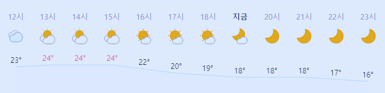 어제보다 2도 높은 최저기온, 어제보다 2도 낮은 최고기온입니다 아침에 최저기온 영상 13도이고 낮 최고기온 영상 24도입니다 오전 2시 - 6시 최저기온이고, 낮 13시 - 15시 최고기온입니다