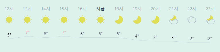 최저기온 2도(오전), 0도(밤), 최고기온 7도(오후)