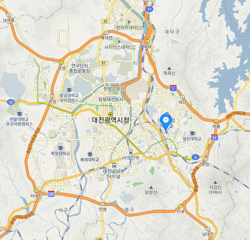 지도는 대전시를 담고 있습니다. 대전은 달리 부연 설명이 필요 없는 곳이죠. 대전으로 여러 고속도로들이 지나고 고속도로 분기점만 해도 어지러울 정도로 많고 기차가 다니는 철로 역시 크게 다르지 않습니다.