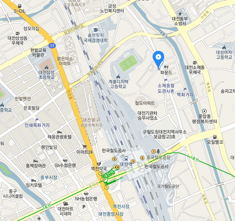 지도의 중앙으로 철로가 지납니다. 한국철도공사 본사와 철도역 대전역 그리고 한국철도공사 대전충청본부가 위치합니다.