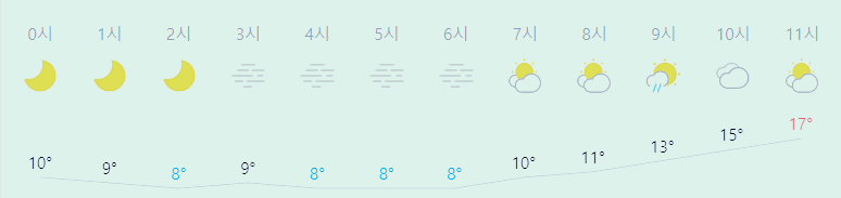 어제보다 2도 높은 최저기온, 어제보다 2도 낮은 최고기온입니다 아침에 최저기온 영상 8도이고 낮 최고기온 영상 17도입니다 오전 2시 - 6시 최저기온이고 낮 12시 - 15시 최고기온입니다