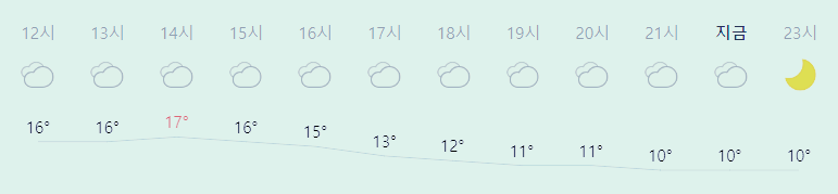 최저기온 12도(새벽), 9도(밤), 최고기온 17도(아침, 낮)