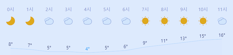 최저기온 8도(오전, 밤), 최고기온 16도(낮)