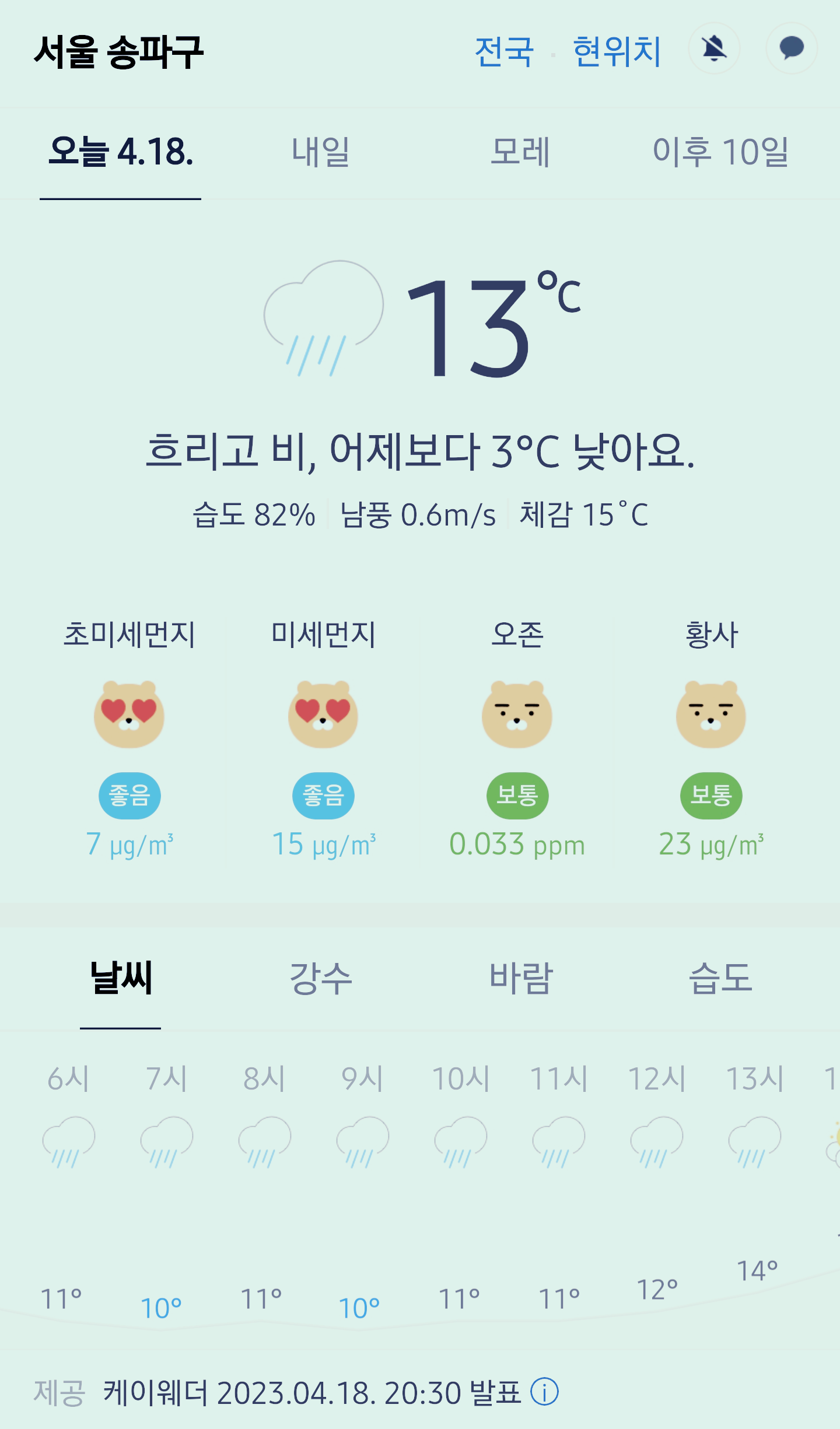 서울 강남 송파구 오늘의 날씨 2023년 4월 18일 (20시 30분 현재)