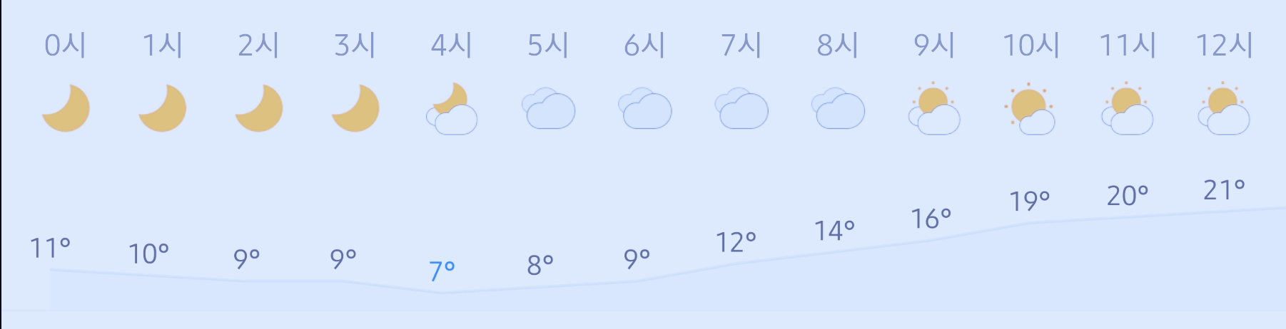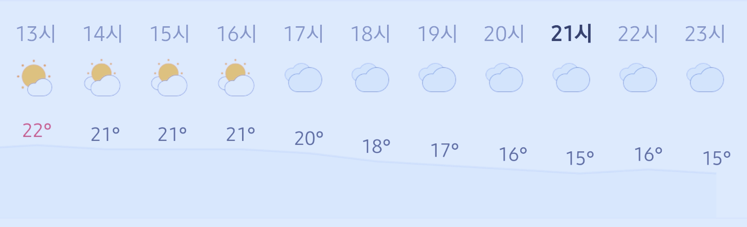최저기온 11도(오전, 심야), 최고기온 21도(낮)