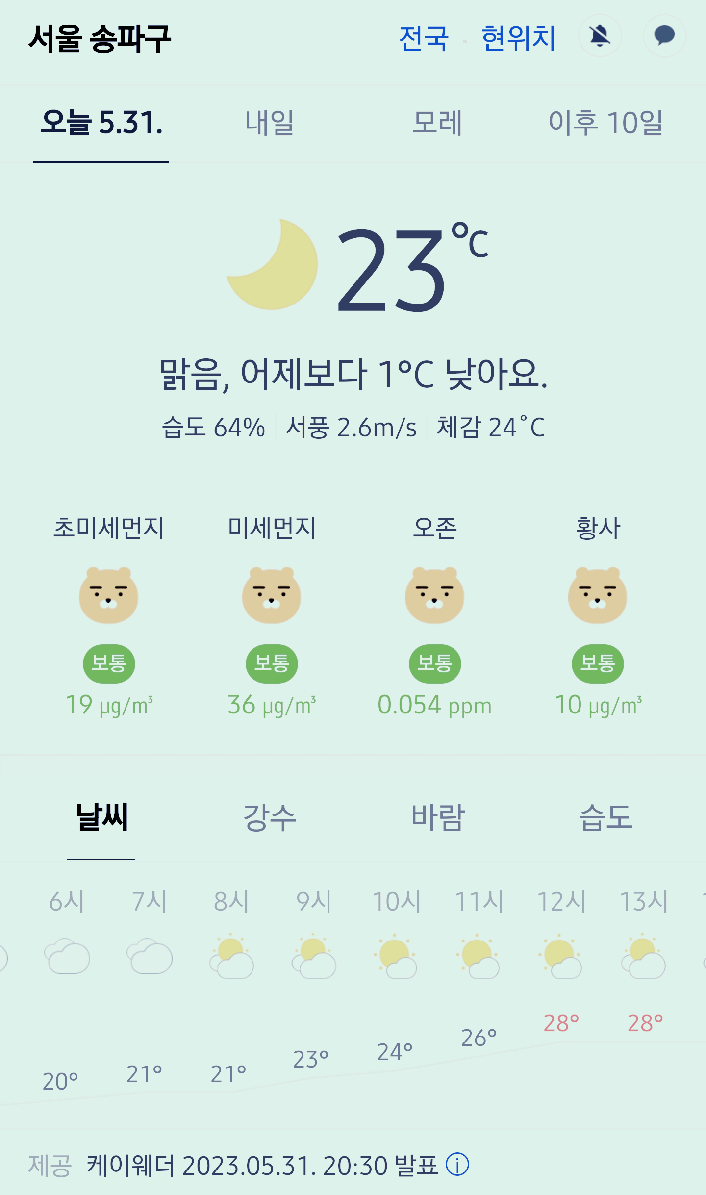 서울 강남 송파구 오늘의 날씨 2023년 5월 31일 (20시 30분 현재)