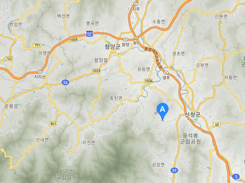 아래 지도에서 표시된 곳이 '사찰음식 명장' 대안 스님과 지은 스님이 계신 경남 산청의 암자 금수암 위치입니다.