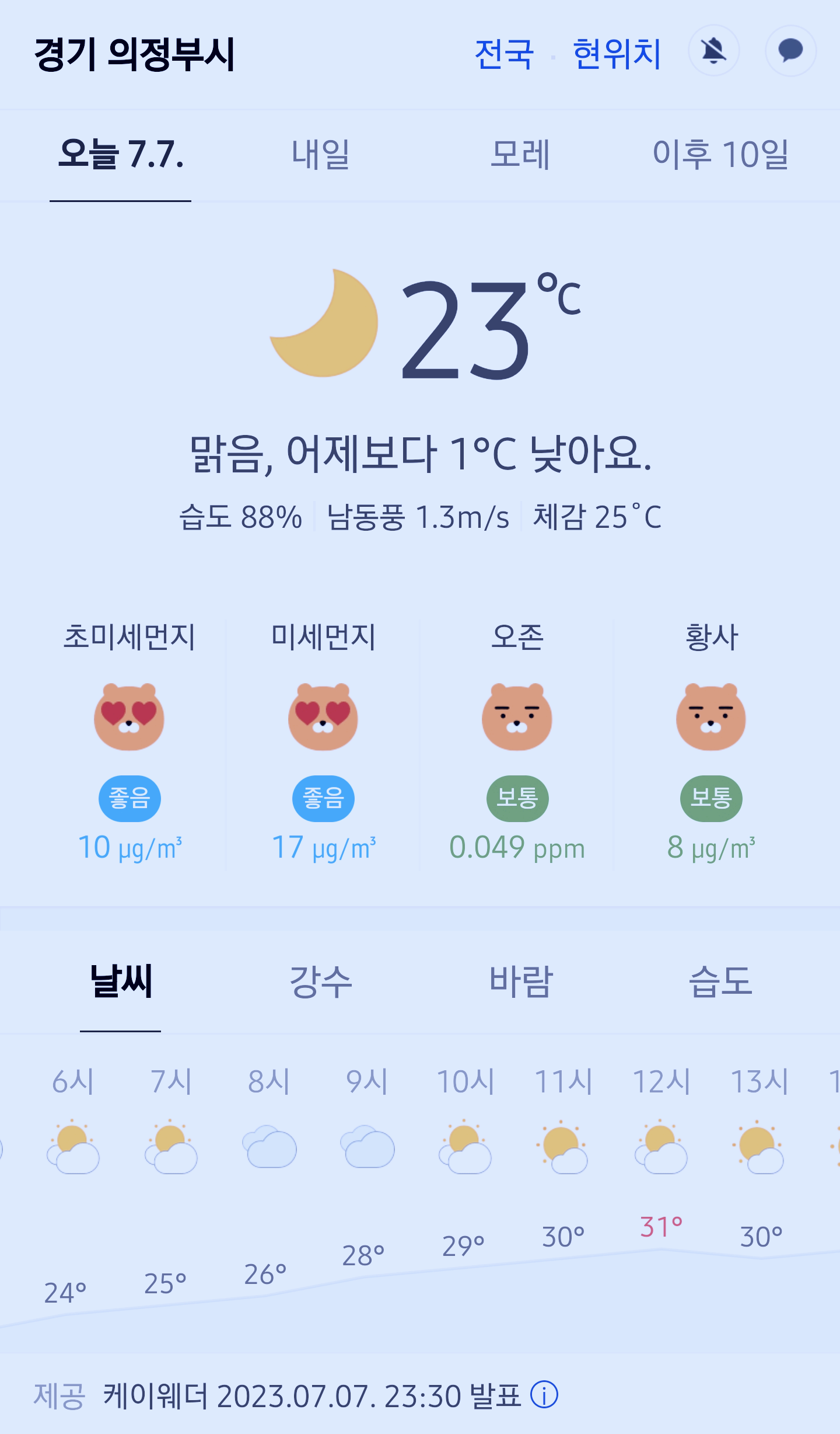 경기도 의정부시 오늘의 날씨 2023년 7월 7일 (23시 30분 현재)