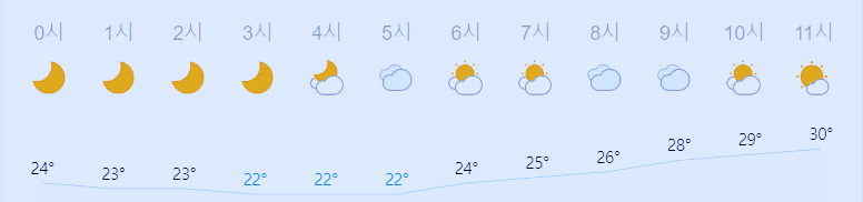 어제와 같은 최저기온, 어제보다 1도 낮은 최고기온입니다 아침에 최저기온 영상 24도이고 낮에 최고기온 영상 31도입니다 오전 3시 - 5시 최저기온이고 낮 12시 - 14시 최고기온입니다