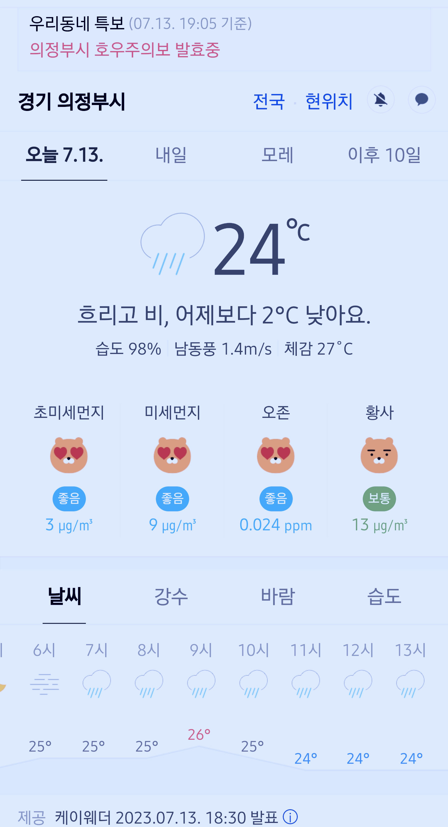 >>>경기도 의정부시 날씨 2023년 7월 13일. 의정부 날씨, 호우주의보 발효중, 오늘의 날씨, 오늘 날씨, 2023 0713, 초미세먼지, 미세먼지, 황사, 자외선