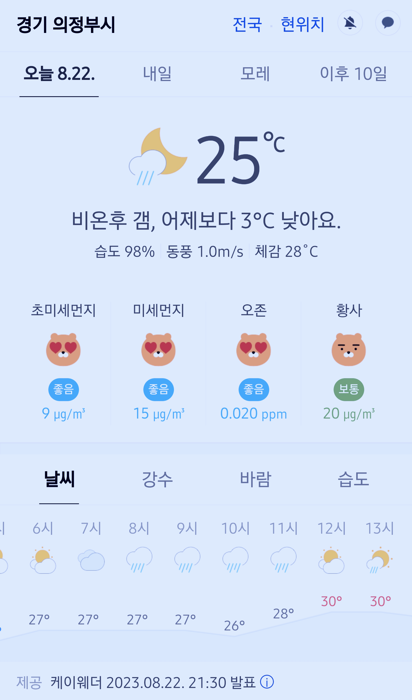 경기도 의정부시 오늘의 날씨 2023년 8월 22일 (21시 30분 현재)