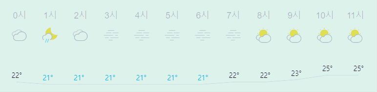 최저기온 22도(오전), 21도(밤), 최고기온 25도(오전), 24도(낮)
