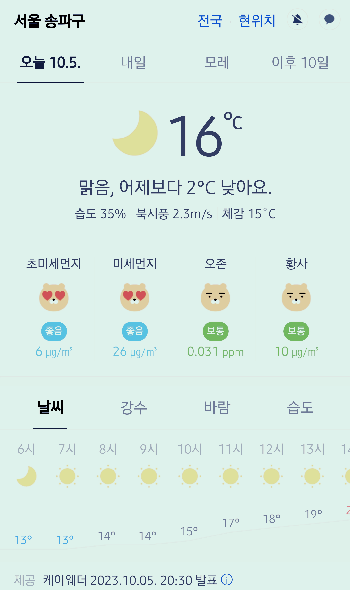 서울 강남 송파구 오늘의 날씨 2023년 10월 5일 (20시 30분 현재)