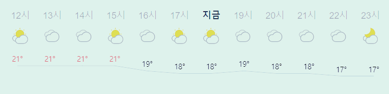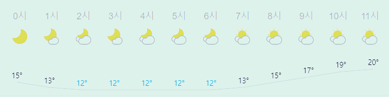 최저기온 12도(오전), 최고기온 21도(낮)