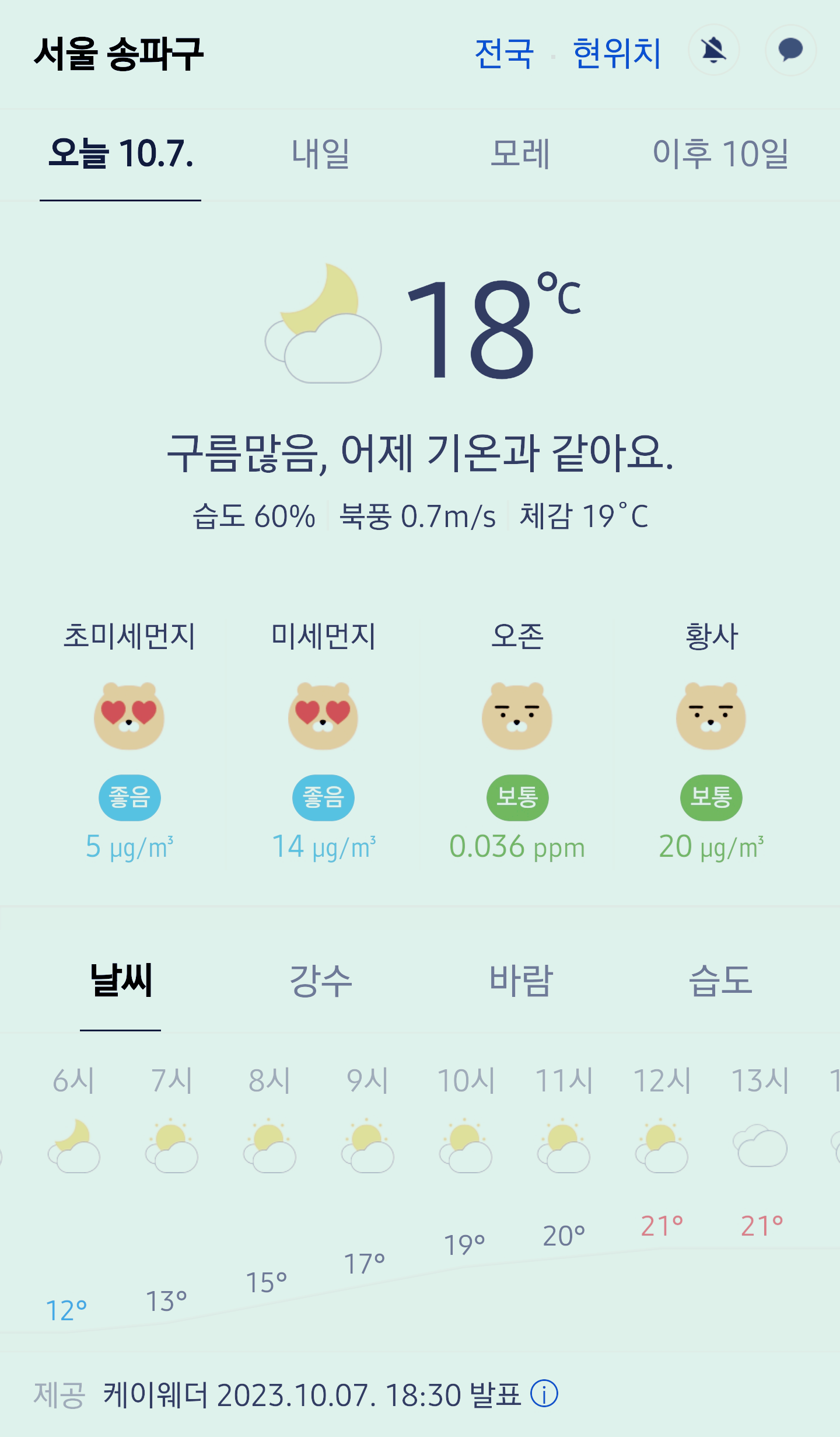 서울 강남 송파구 오늘의 날씨 2023년 10월 7일 (18시 30분 현재)