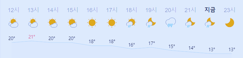 어제와 같은 최저기온, 어제보다 1도 높은 최고기온입니다 아침에 최저기온 영상 14도이고 낮에 최고기온 영상 21도입니다 오전 2시 - 4시 최저기온이고 낮 13시 최고기온입니다