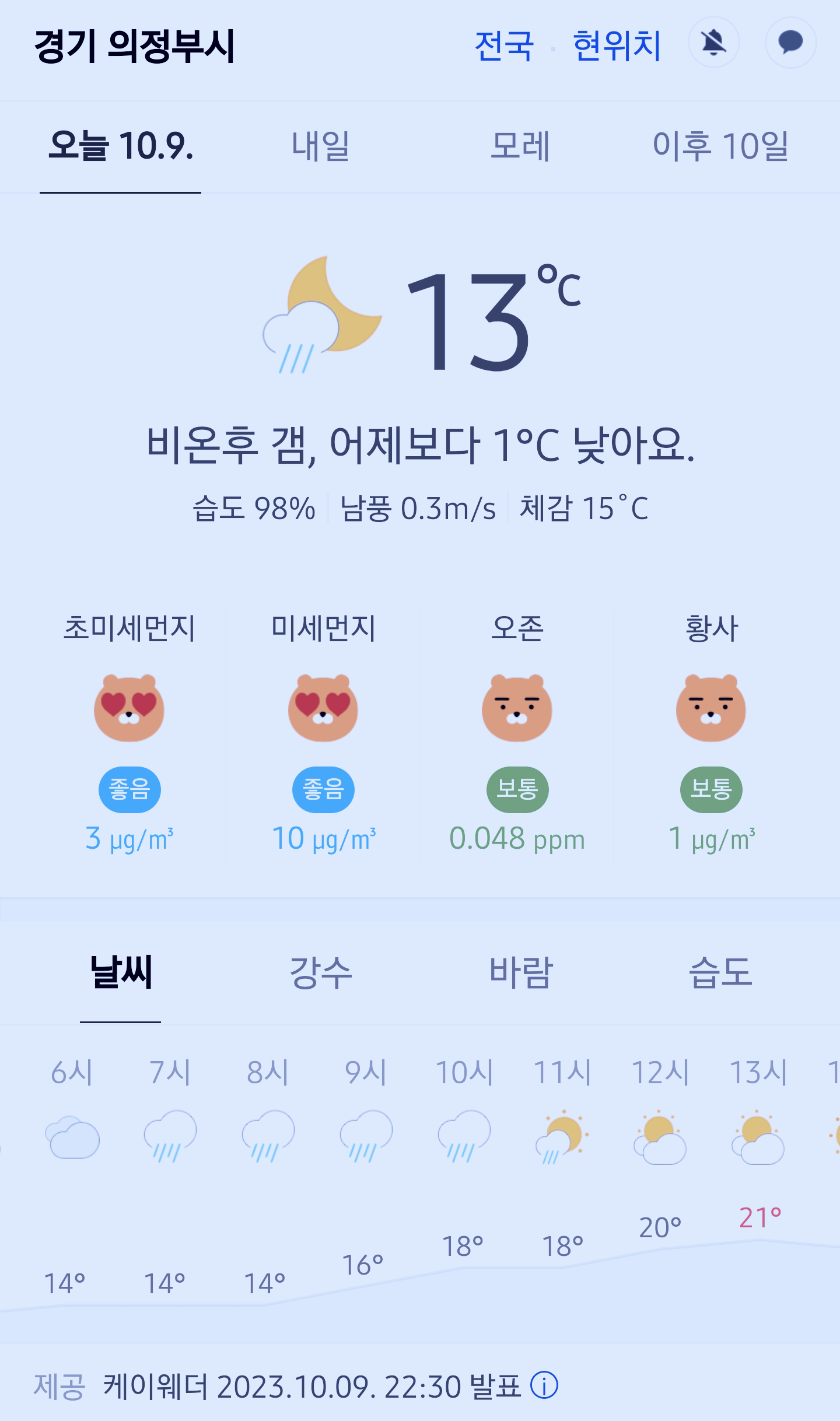경기도 의정부시 오늘의 날씨 2023년 10월 9일 (22시 30분 현재)