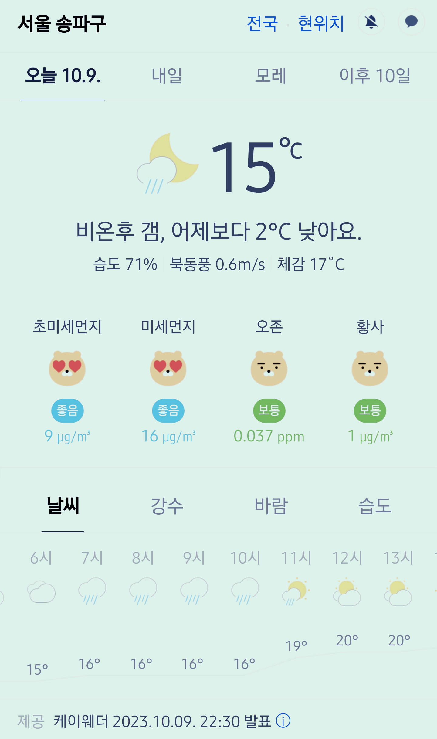 서울 강남 송파구 오늘의 날씨 2023년 10월 9일 (22시 30분 현재)