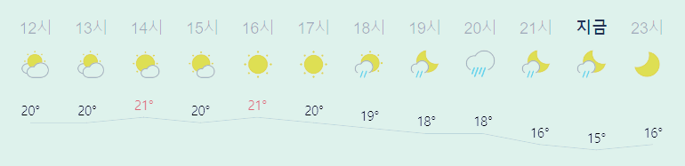 어제보다 1도 낮은 최저기온, 어제보다 2도 높은 최고기온입니다 아침에 최저기온 영상 15도이고 낮에 최고기온 영상 21도입니다 오전 4시 최저기온이고 낮 14시 - 16시 최고기온입니다