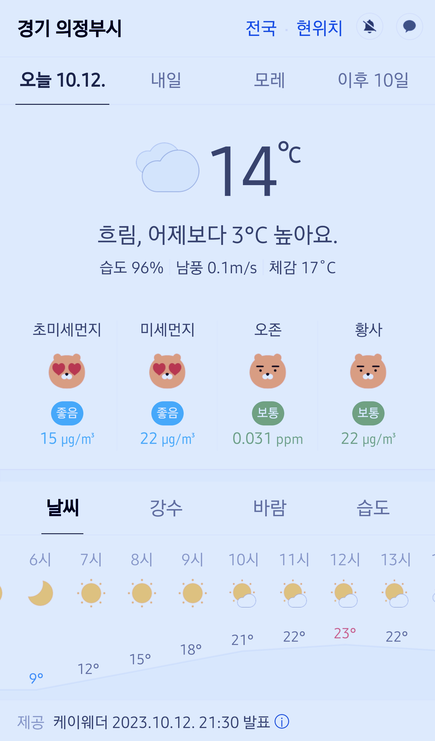 경기도 의정부시 오늘의 날씨 2023년 10월 12일 (21시 30분 현재)