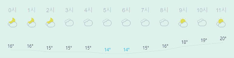 어제보다 2도 높은 최저기온, 어제보다 3도 낮은 최고기온입니다 아침에 최저기온 영상 14도이고 낮에 최고기온 영상 21도입니다 오전 5시 - 6시 최저기온이고 낮 12시 - 16시 최고기온입니다