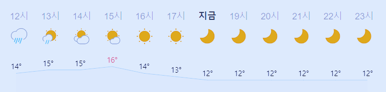 어제보다 1도 낮은 최저기온, 어제보다 5도 낮은 최고기온입니다 아침에 최저기온 영상 12도이고 낮에 최고기온 영상 16도입니다 오전 2시 - 5시 최저기온이고 낮 15시 최고기온입니다