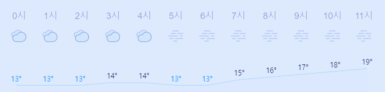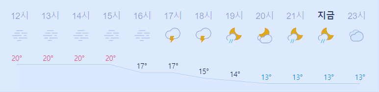 최저기온 13도(오전, 밤), 최고기온 20도(낮)