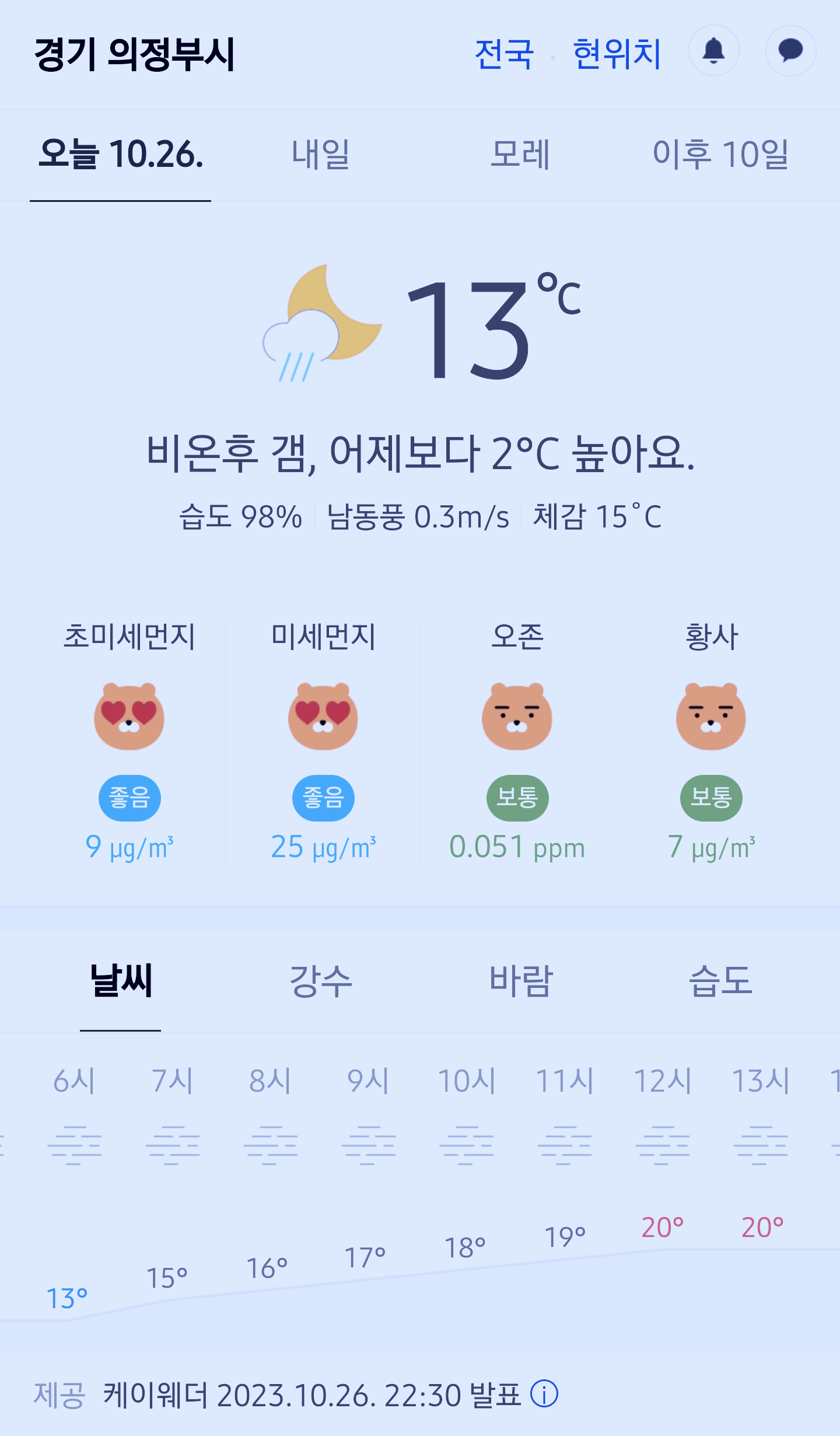 경기도 의정부시 오늘의 날씨 2023년 10월 26일 (22시 30분 현재)