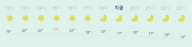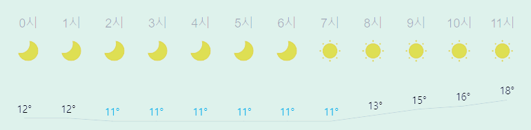 어제보다 1도 높은 최저기온, 어제보다 1도 높은 최고기온입니다 아침에 최저기온 영상 11도이고 낮에 최고기온 영상 21도입니다 새벽 2시 - 7시 최저기온이고 낮 15시 최고기온입니다
