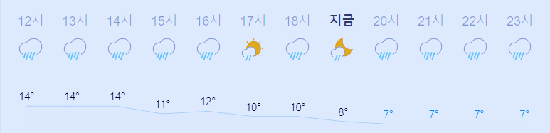 어제보다 7도 낮은 최저기온, 어제보다 1도 낮은 최고기온입니다 아침에 최저기온 영상 14도이고 낮에 최고기온 영상 14도입니다 오후에 기온이 떨어지기 시작해서 밤에는 영상 7도입니다 내일 오전에는 영상 2도까지 내려간다고 합니다
