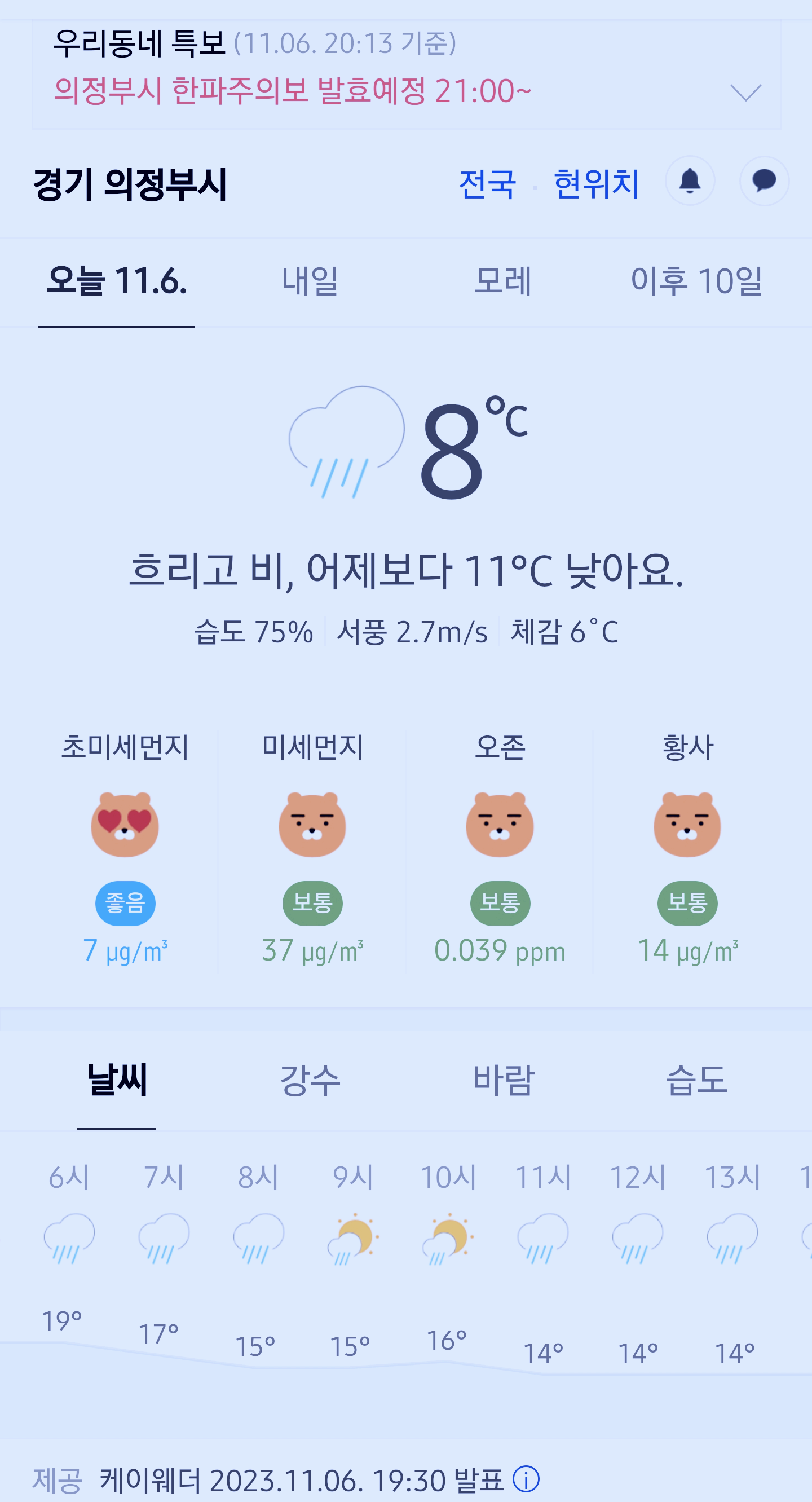 >>>경기도 의정부시 날씨 2023년 11월 6일. 의정부 날씨, 한파주의보 발효 예정, 강풍주의보 발효중, 오늘의 날씨, 오늘 날씨, 2023 1106, 초미세먼지, 미세먼지, 황사, 자외선
