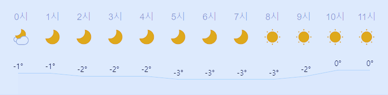 최저기온 -3도(오전), -5도(밤), 최고기온 1도(오후)