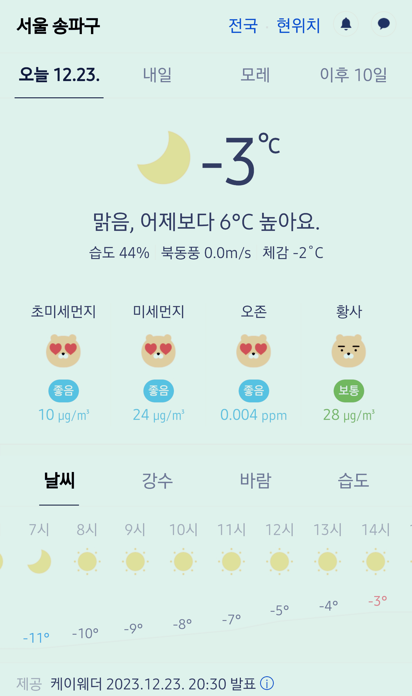 서울 강남 송파구 오늘의 날씨 2023년 12월 23일 (20시 30분 현재)