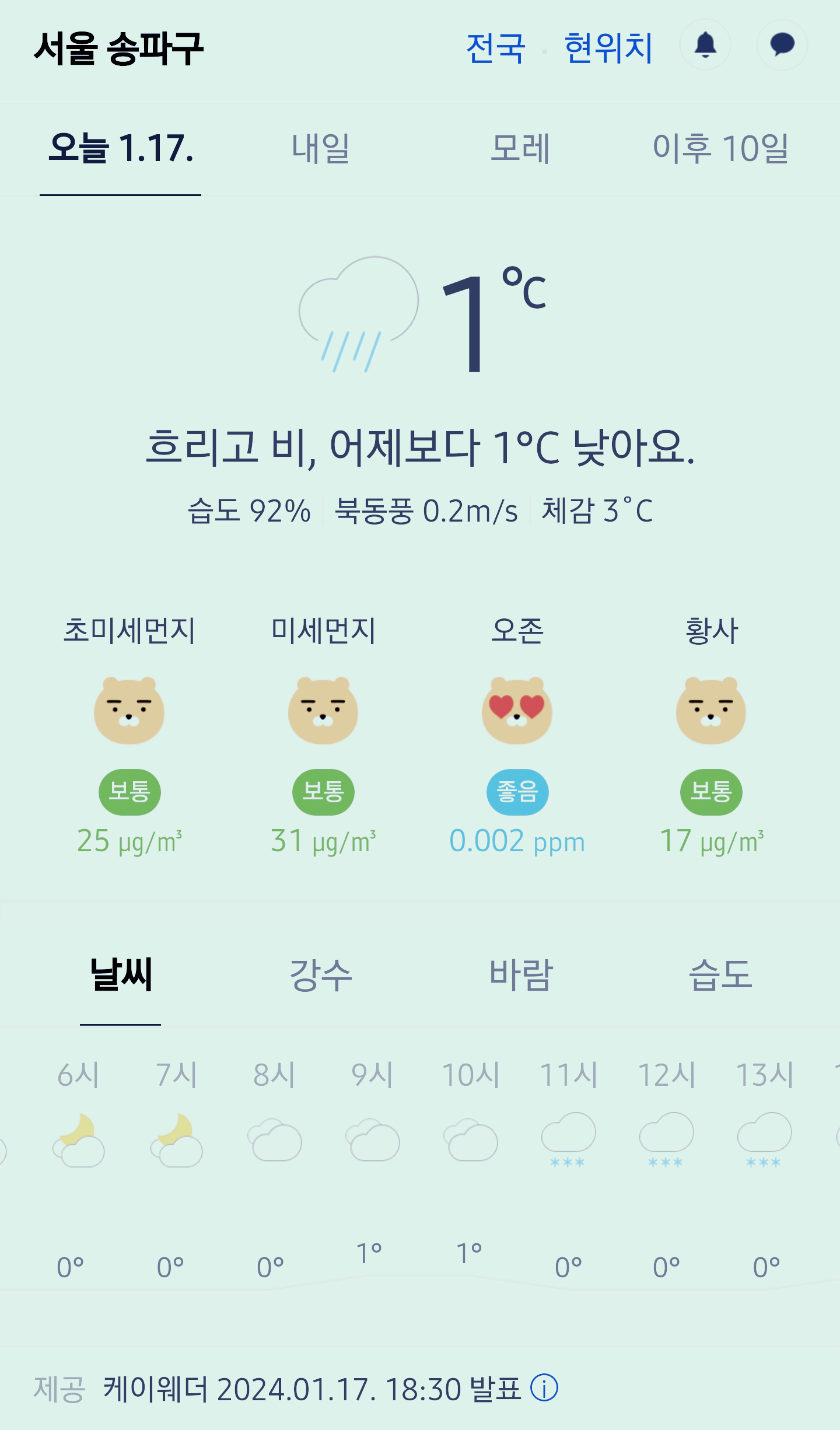 서울 강남 송파구 오늘의 날씨 2024년 1월 17일 (18시 30분 현재)