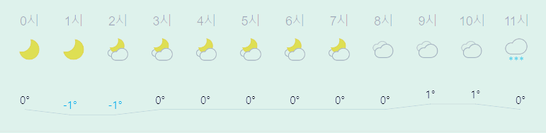 어제보다 4도 높은 최저기온, 어제와 같은 최고기온입니다 아침에 최저기온 0도이고 낮에 최고기온 영상 1도입니다