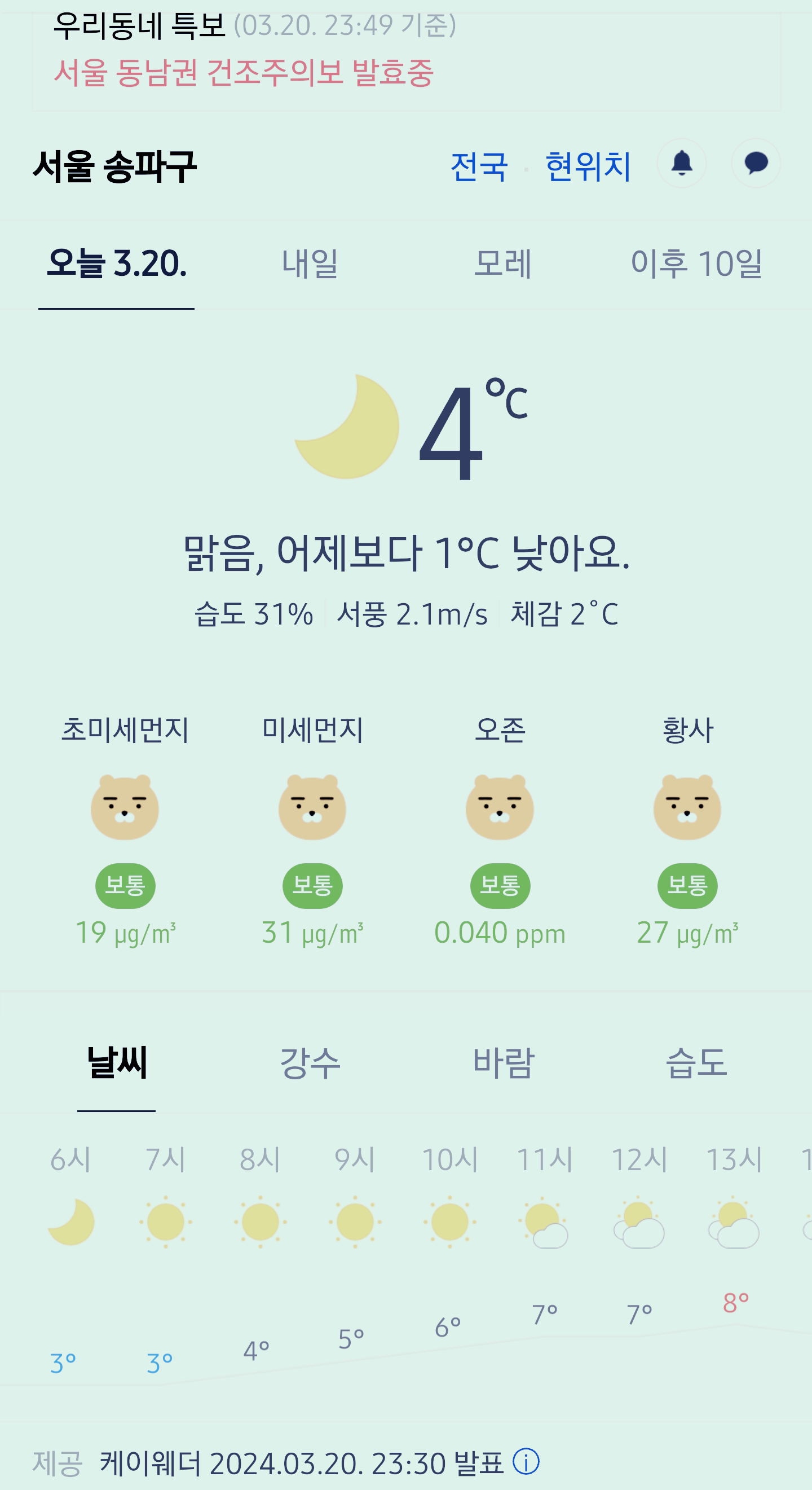 서울 강남 송파구 오늘의 날씨 2024년 3월 20일 (23시 30분 현재)
