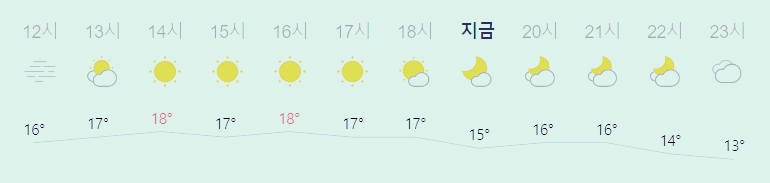 어제보다 6도 높은 최저기온, 어제보다 2도 높은 최고기온입니다 아침에 최저기온 영상 11도이고 낮에 최고기온 영상 18도입니다 오전 1시 - 8시 하루 중 최저기온이고 낮 14시 - 16시 하루 중 최고기온입니다