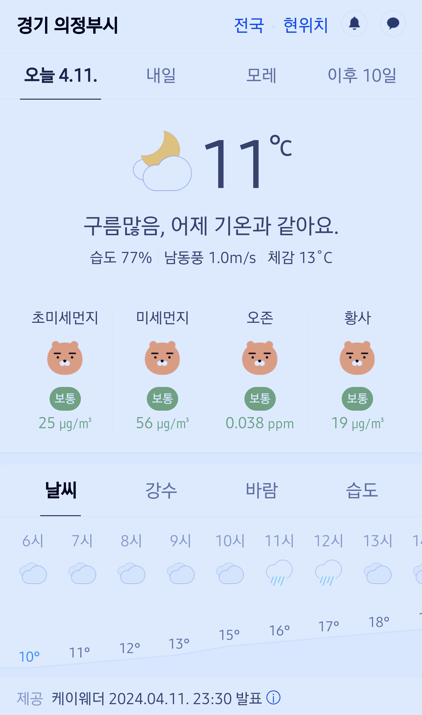 >>>경기도 의정부시 날씨 2024년 4월 11일. 의정부 날씨, 오늘의 날씨, 오늘 날씨, 2024 0411, 초미세먼지, 미세먼지, 황사, 자외선