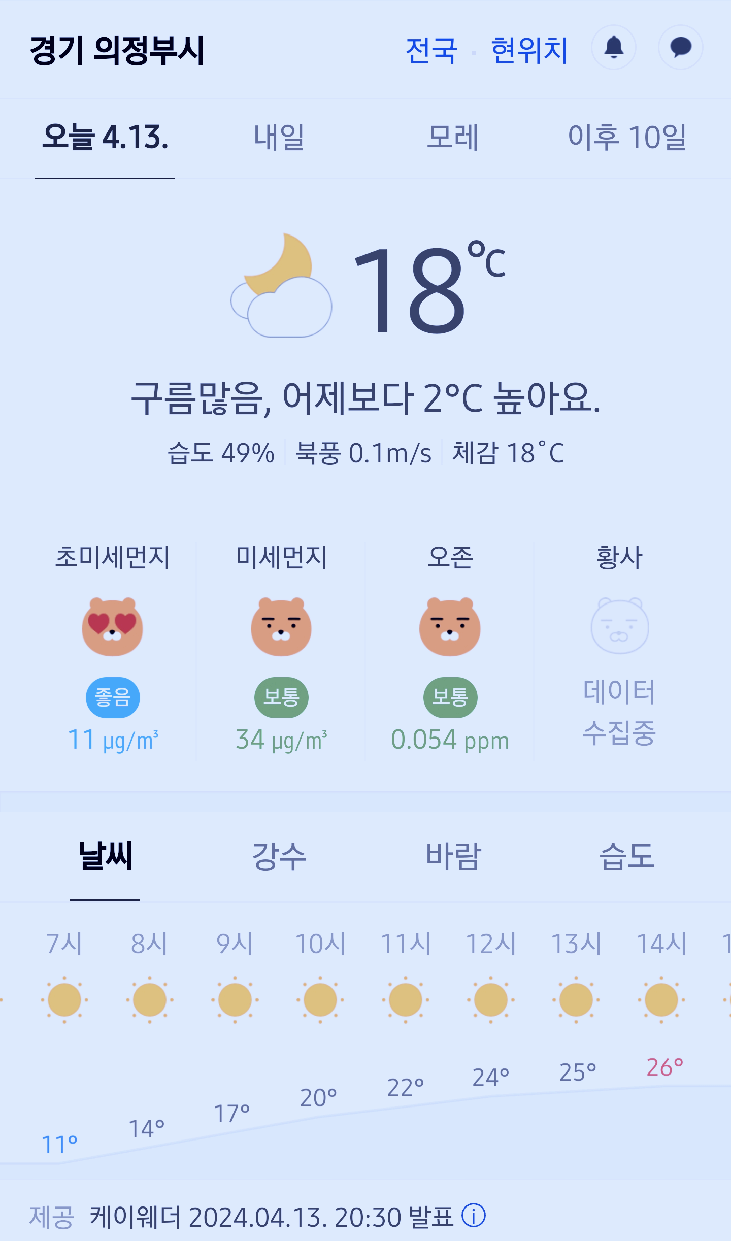 경기도 의정부시 오늘의 날씨 2024년 4월 13일 (20시 30분 현재)