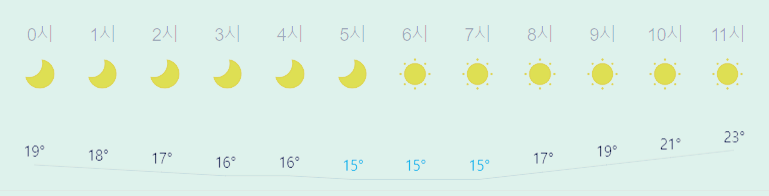 어제보다 2도 높은 최저기온, 어제보다 1도 높은 최고기온입니다 아침에 최저기온 영상 15도이고 낮에 최고기온 영상 28도입니다 오전 5시 - 7시 하루 중 최저기온이고 낮 14시 - 17시 하루 중 최고기온입니다 (어제에 이어) 4월에 낮 최고기온 28도 실화냐!