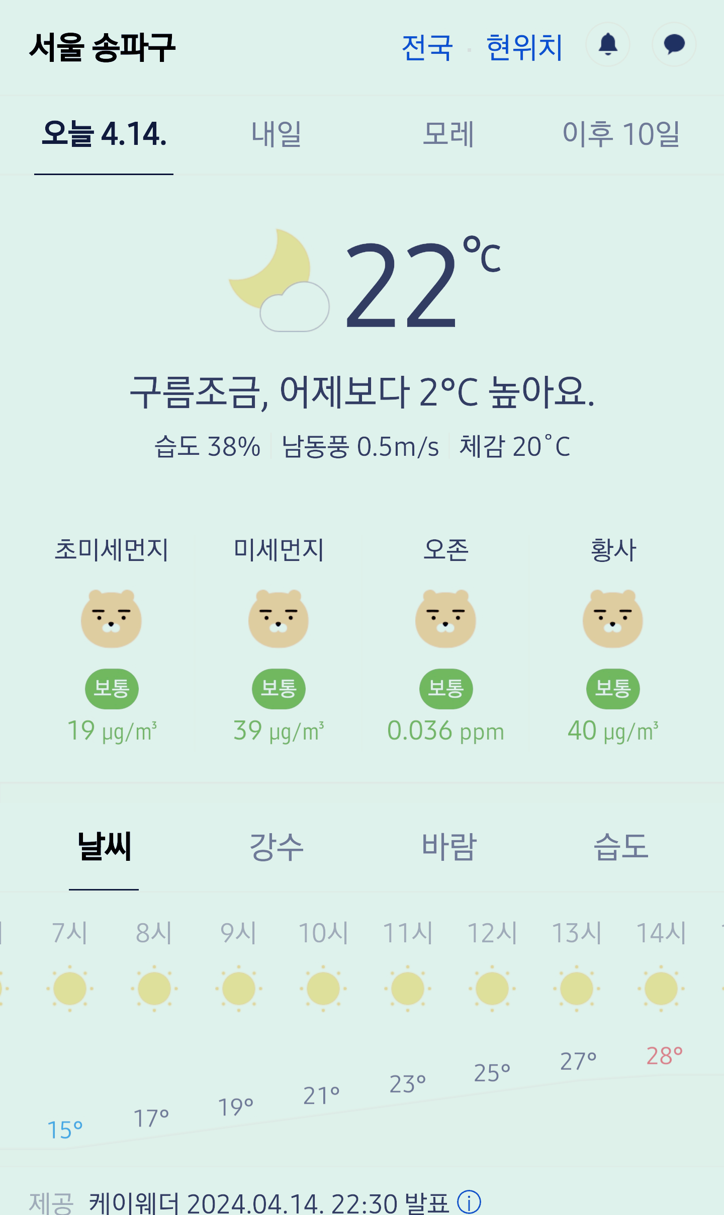 서울 강남 송파구 오늘의 날씨 2024년 4월 14일 (22시 30분 현재)