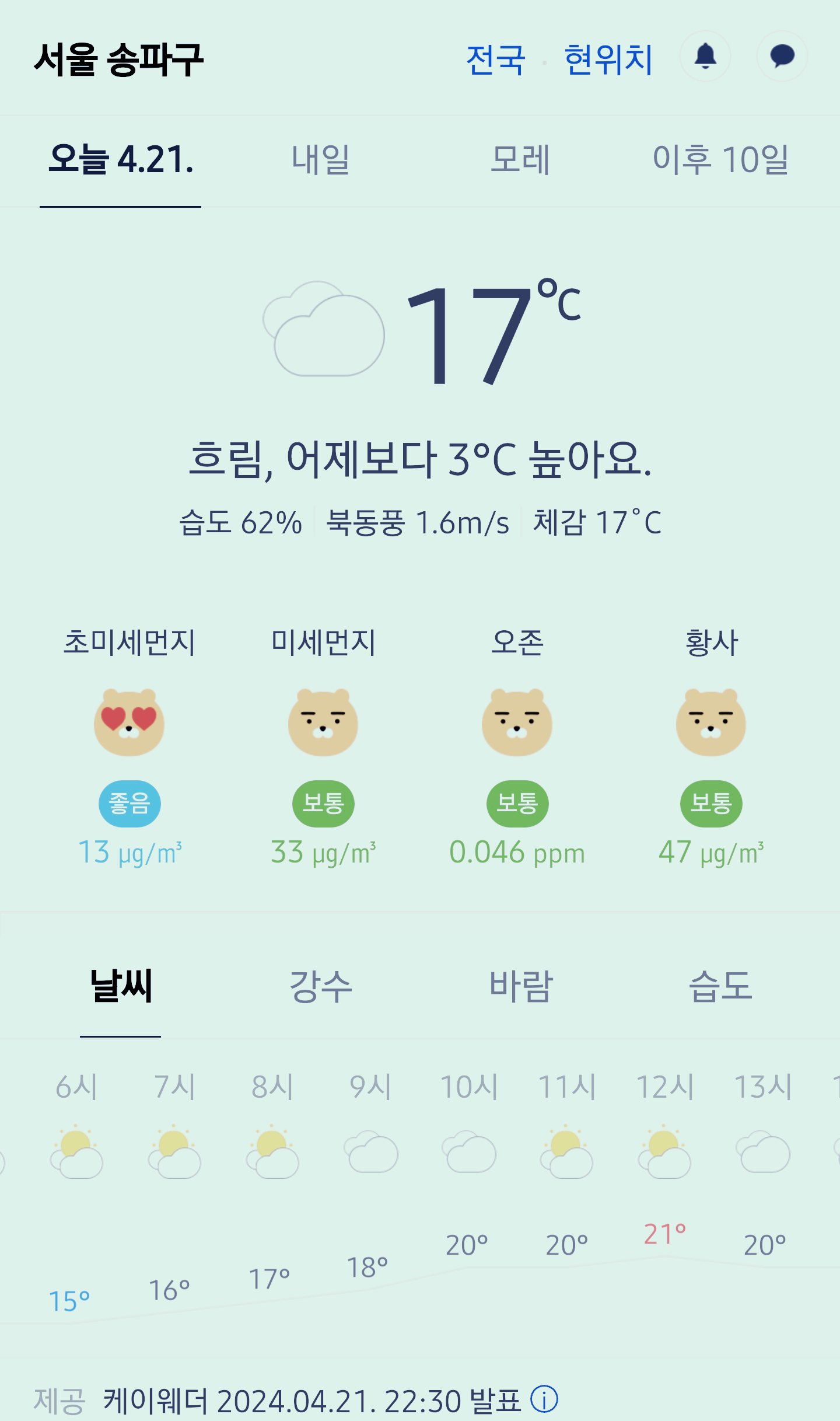 서울 강남 송파구 오늘의 날씨 2024년 4월 21일 (22시 30분 현재)