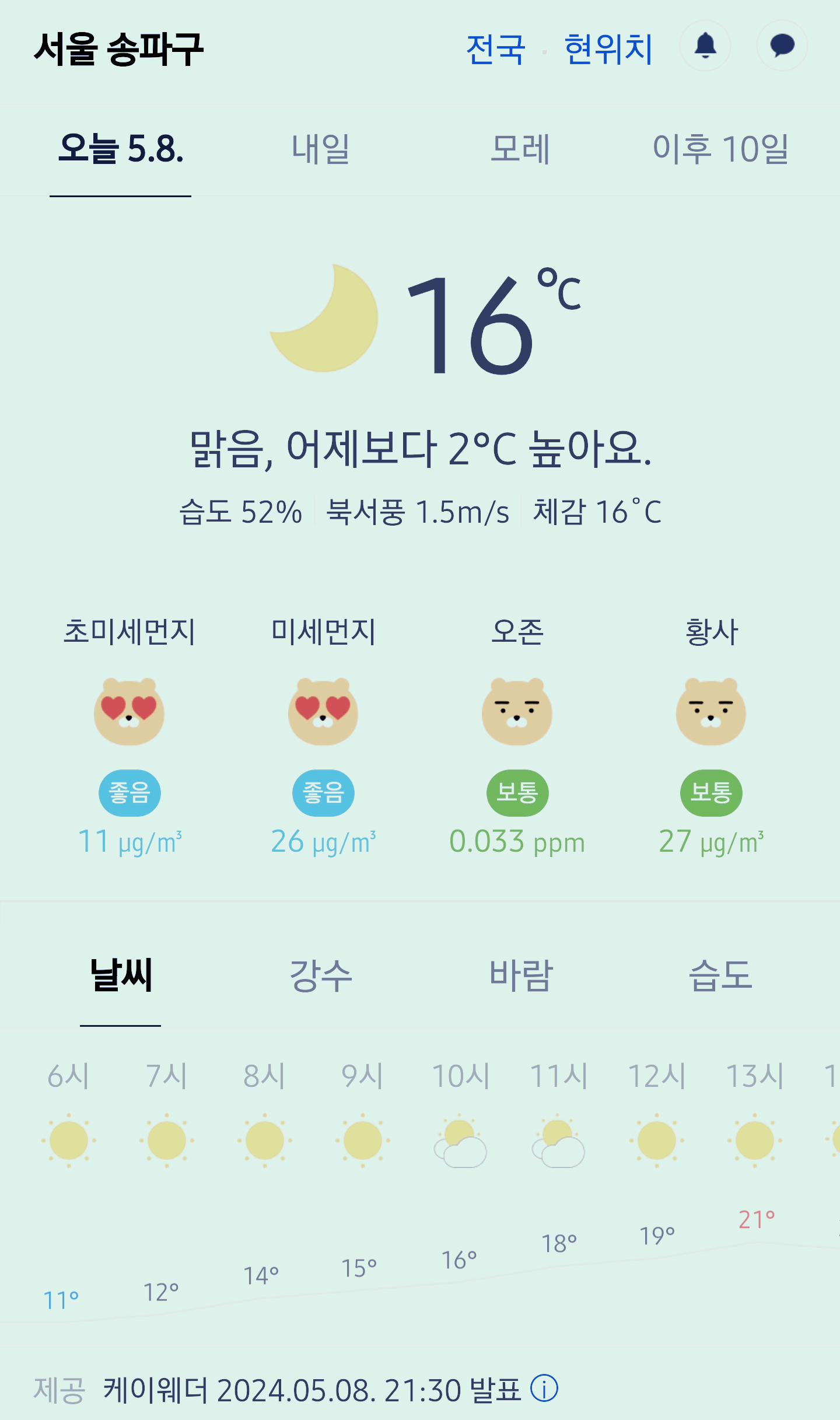 서울 강남 송파구 오늘의 날씨 2024년 5월 8일 (21시 30분 현재)