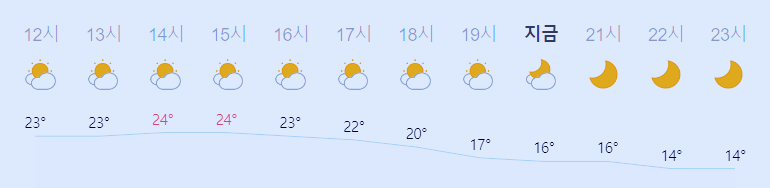 어제보다 3도 높은 최저기온, 어제보다 2도 높은 최고기온입니다 아침에 최저기온 영상 13도이고 낮에 최고기온 영상 24도입니다 오전 4시 - 5시 하루 중 최저기온이고 낮 14시 - 15시 하루 중 최고기온입니다
