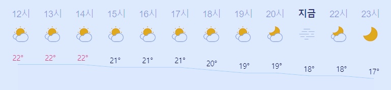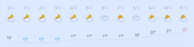 어제보다 1도 높은 최저기온, 어제보다 6도 낮은 최고기온입니다 아침에 최저기온 영상 17도이고 낮에 최고기온 영상 22도입니다 오전 1시 - 3시 하루 중 최저기온이고 오전 11시 - 낮 14시 하루 중 최고기온입니다